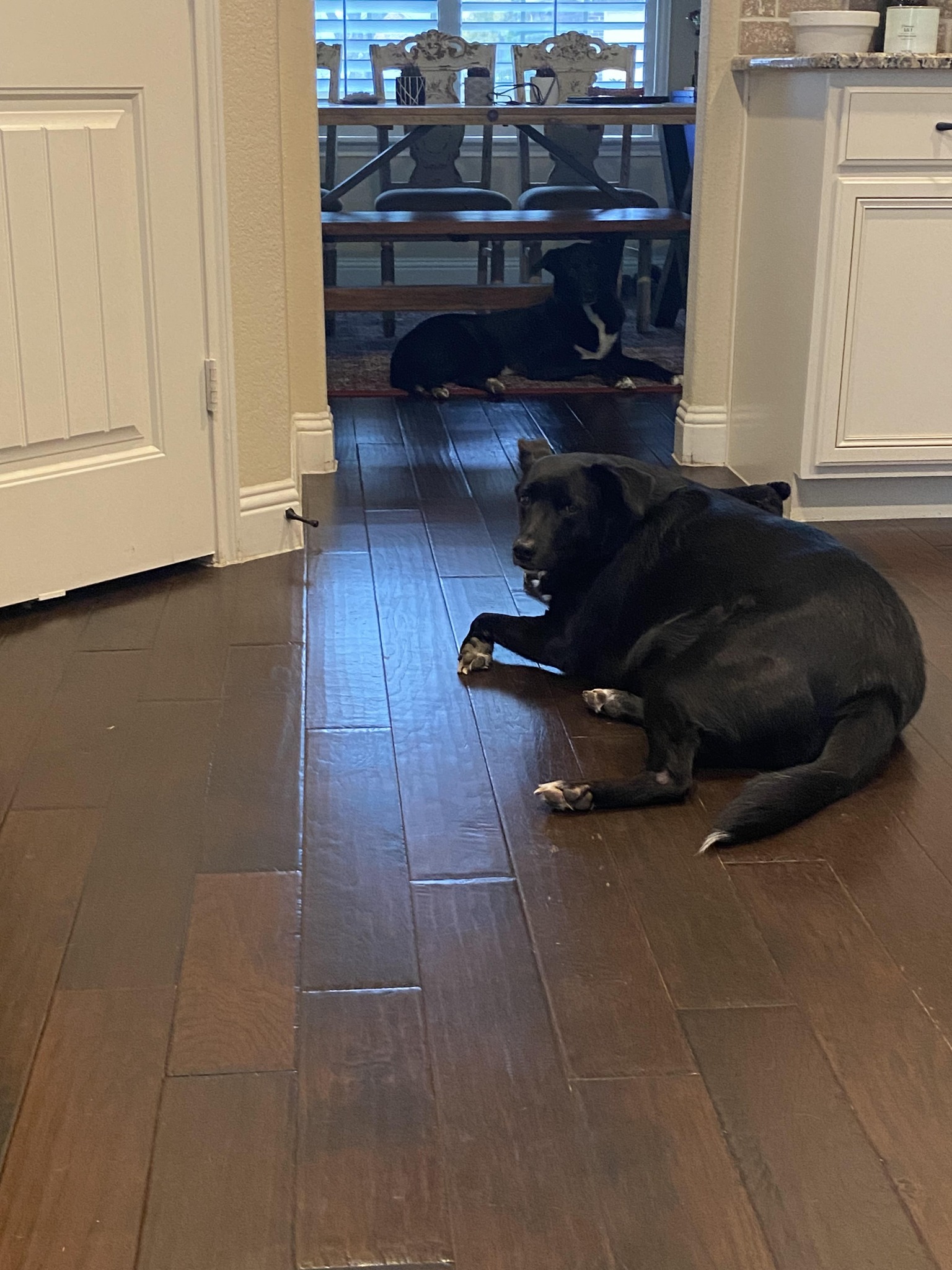 Our sweet girl, Pilot, joins a busy family with both human and doggy siblings to play with. Pilot has quite a history with RHS – she is the Mama of the Grand Ole Opry litter who were adopted in 2020! When her previous family fell on hard times, they surrendered Pilot to RHS to give her a better life; the family who adopted one of Pilot’s pups stepped up and agreed to foster her. They quickly realized that Pilot was also meant to be part of their family so now she and her daughter, Reba (seen in the background of Pilot’s photo), are together again! Pilot (they will keep her name) was terribly overweight when she went to her foster home – she couldn’t climb the stairs and could barely roll over – but they’ve been working diligently with her and she’s becoming quite a bit more active. Mom, Meredith, said she and Reba play all day now.