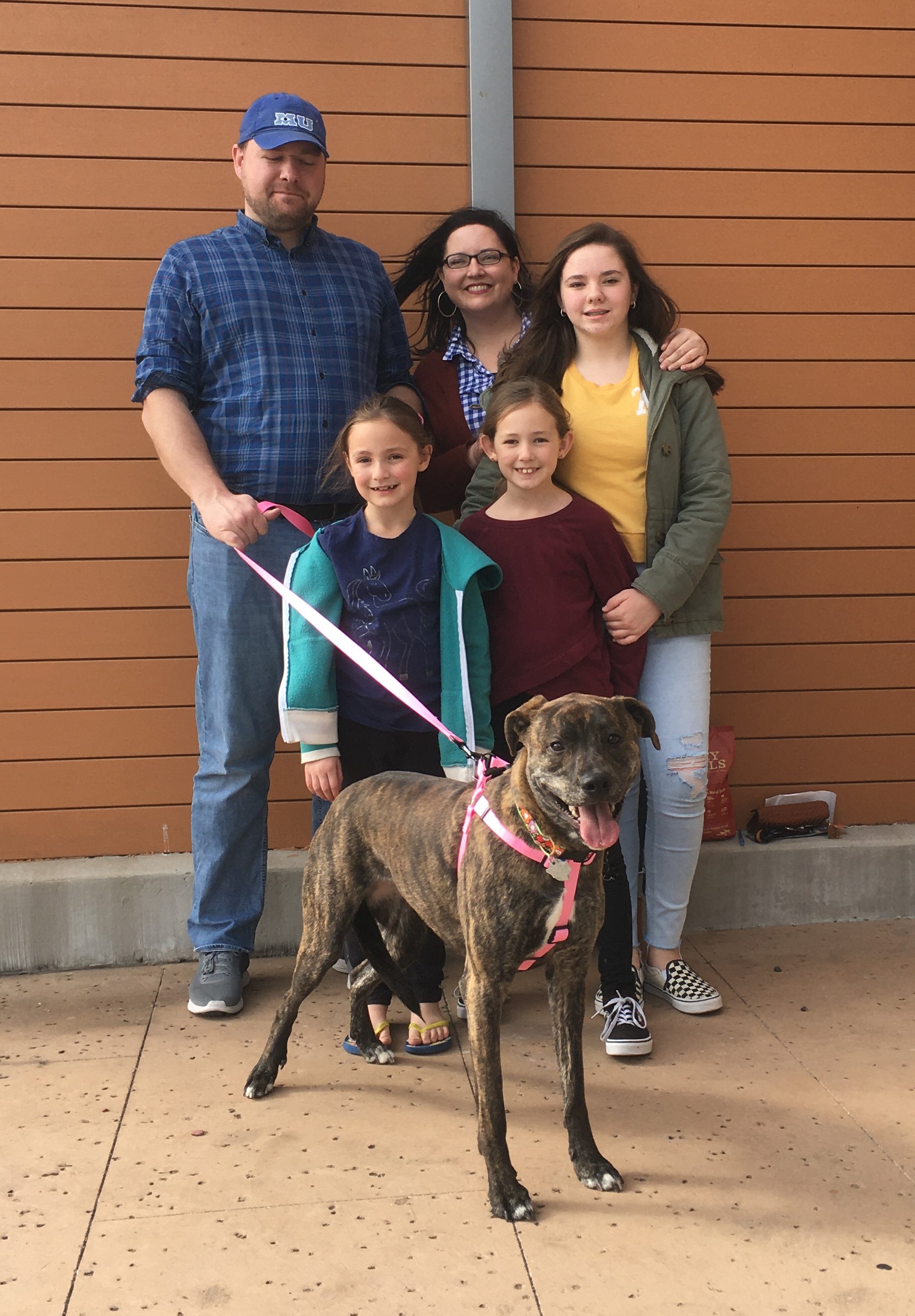 Our big, beautiful brindle girl, Rosie, was adopted today! She joins a lively family of three girls, Mom and Dad and a Labradoodle named Bailey, so she’ll have lots of people to love on her and a canine playmate to hang with. Although normally shy, at the home visit she made herself right at home by eating Bailey’s lunch, leaving him staring in shock! It seems clear that she’s going to be a Daddy’s girl as she gravitates naturally to Nate, although Mom, Mindy, will be home far more often so that could change as Rosie settles in. They plan to keep her name since she’s comfortable with it and it suits her.