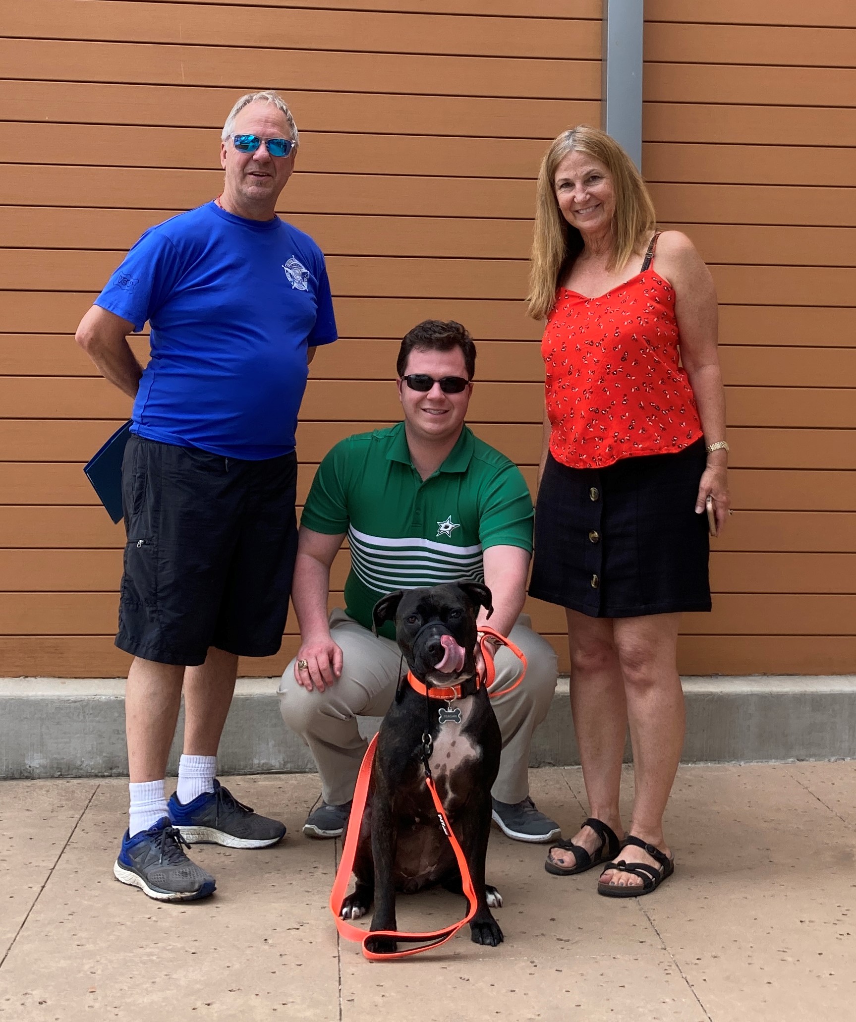 Our brindle pittie girl, Teagan, was adopted! She now has a young, single dad to call her own, and human “grandparents” who adore her as well. They plan to keep her name but probably call her Tea-Tea for short. Abandoned when her previous people moved away and left her behind, Teagan was fostered by Andie and her dog Chloe, who taught Teagan that toys are fun and couches are comfy places to hang out, especially when there’s a human there as well to snuggle with.