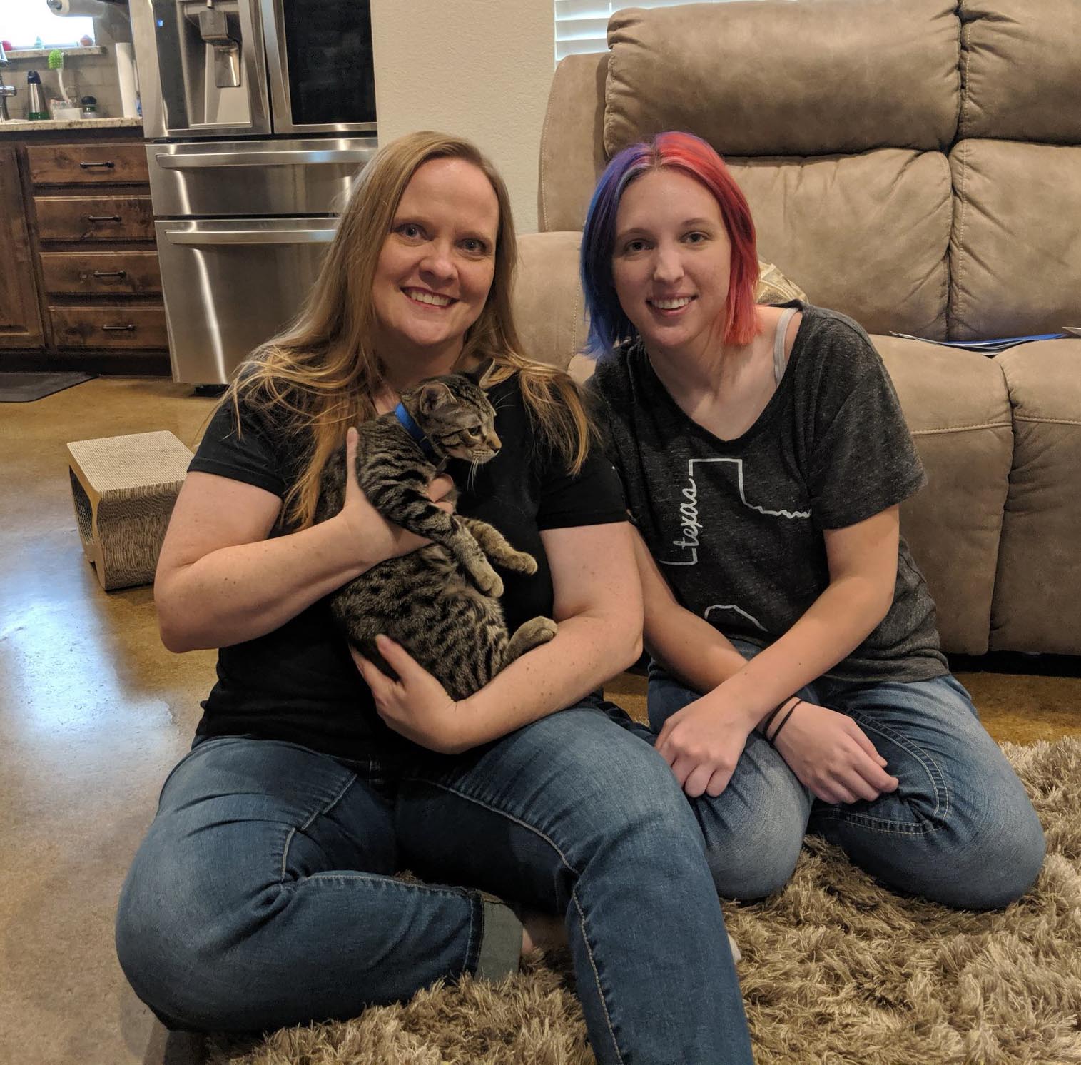 The home visit was a success and Usher was adopted today! Luna and Usher have their very own “cat wheel” – like a hamster wheel but cat-sized – for indoor running to burn off kitten energy, and a ton of toys and climbing trees. Together, the two cats are going to be very, very spoiled and happy! In addition to Alyssa and Luna, Usher’s new “grand-human” also lives with them, so each cat will have a lap to sit in.