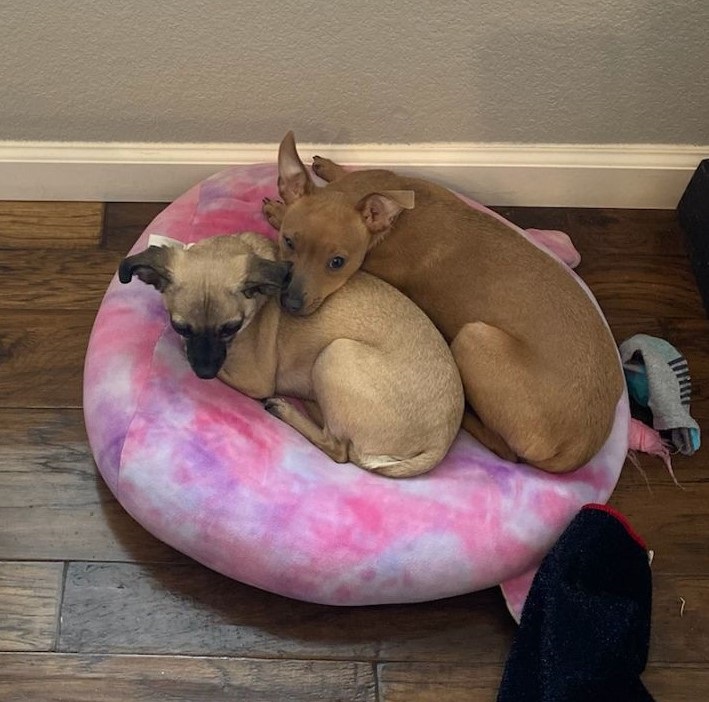 Now known as Biscuit, she joins a busy household with 2 teenaged human siblings, an older chocolate lab named Charlie and a Chi/Pug named Arlo who is her best friend. There’s always a lot going on at that house and the dogs are always right in the middle of it. Her mom, Jaleah, says that Biscuit is “vivacious,” outgoing and loving – she always needs to be touching people.Jaleah did a DNA test on her: 40% Chihuahua/Miniature Pinscher (no surprise there), but also Pekinese, CHOW CHOW (?) and 8% Rottweiler! Maybe the Rottweiler accounts for the long supermodel legs! Thanks to Nancy V who fostered Wren, mama Fern (now Fi) and brother Heath (now Tito) when they were rescued from the Denton Shelter and to Allison MaClendon who fostered Wren and Heath after they were weaned. ![]()